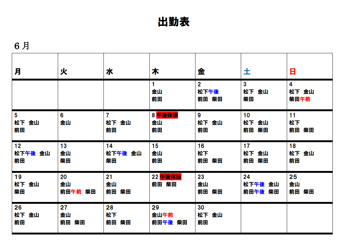 6月の出勤表になります。