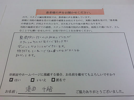 接骨院に行くのは初めてでしたがスタッフの方々が気さくではなしやすく安心してかようことができています。 施術もていねいで体のつかれがよくとれ助かってます。